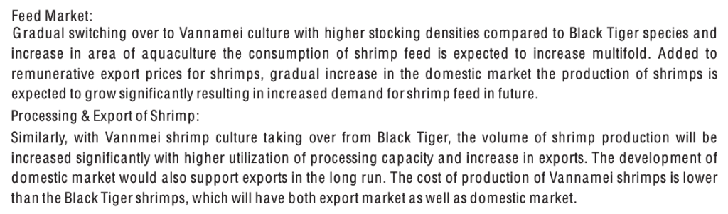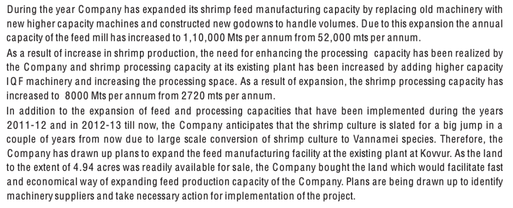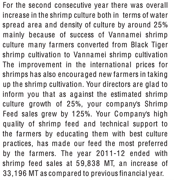 While reading the annual report of 2012 of the company which is very detailed, we realise the company is in the business of producing feeds for shrimps (Majorly exporting).