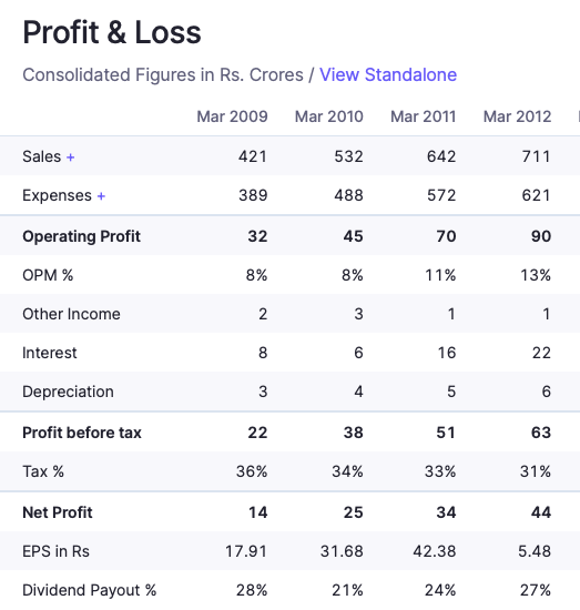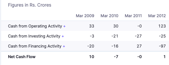 Since the asset turnover ratios and margins are almost similar there does not seem to be any difference in the cash flow profile of the business. Speaking in very simple terms in 2009, with 1 unit of assets company generated approx Rs 3 of sales with 20% margin. This profile is similar in 2012.