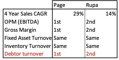 Another, Big difference, between the two can be seen from the point of view of distributors- while Page commands payment from debtors within 20-25 days, Rupa gets the same within 60 days. This most probably shows Distributors and hence consumers prefer Page rather than Rupa.