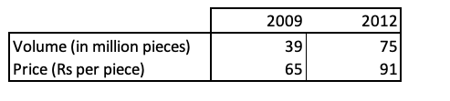 1. Over the past 4 years the Volume growth of the company is 17% CAGR (3.5 crore pieces to 7.4 crore pieces) while the price growth has been 8.8% CAGR (Rs 65 to Rs 91/piece) resulting in 29% CAGR.