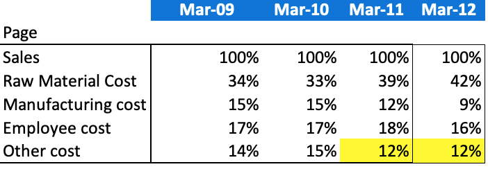 The change in other cost is mainly due to operating leverage kicking in as the advertisement costs have not risen in proportion to sales. Through common size statement we can only say that the costs which were in control of the management have not risen beyond sales.