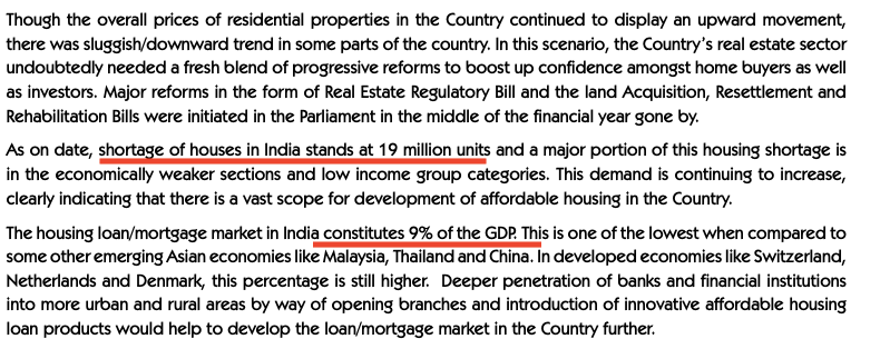 Industry Growth: Overall on the demand side there is shortage of housing units in India. The supply side has slowly started increasing over time, as more and more of low income group enters into the formal sector. Urbanisation over long term has played huge role in the same.