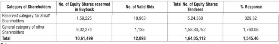On 21st March 2016, through post buyback public announcement , we come to know about the tendering status. Under Small Shareholder 34% have tendered their shares and Under General shareholder 23% have tendered.